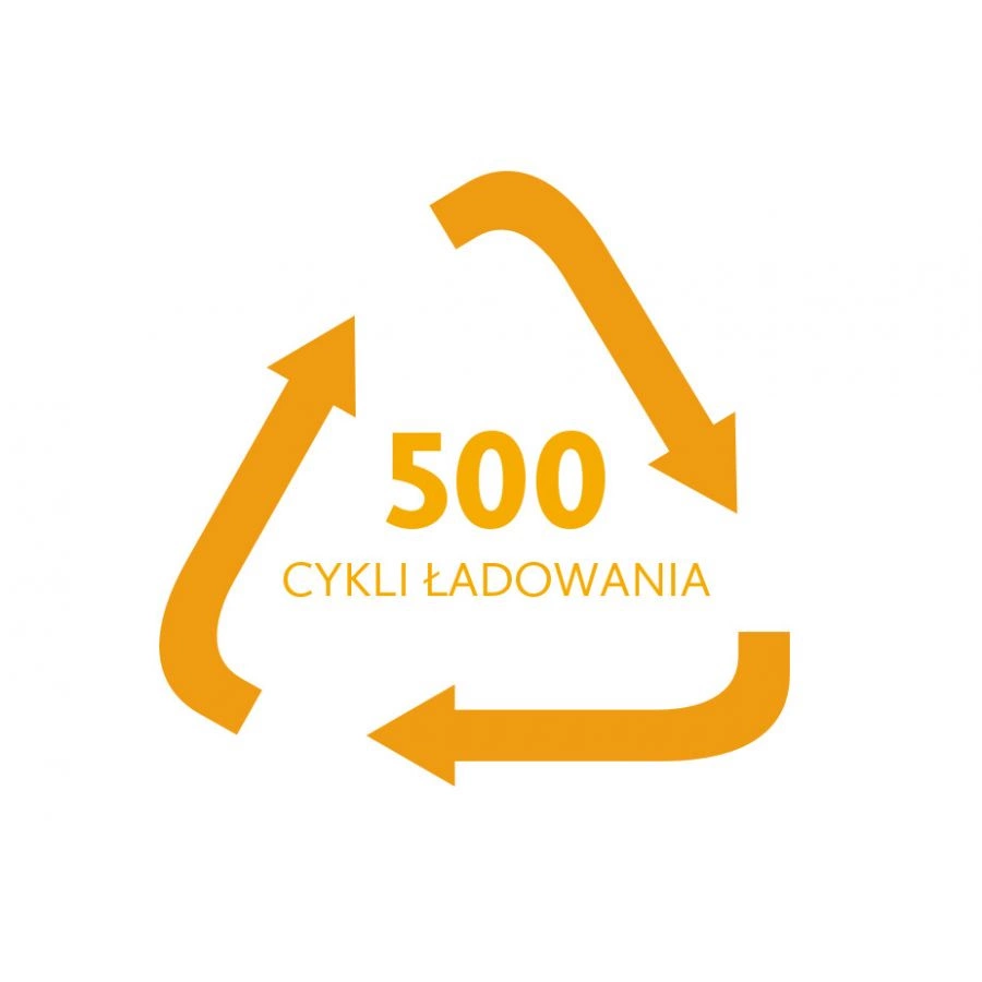- Długa żywotność – akumulator zapewnia aż 500 cykli ładowania z zachowaniem do 75% pojemności, co pozwala na intensywne użytkowanie przez długi czas.