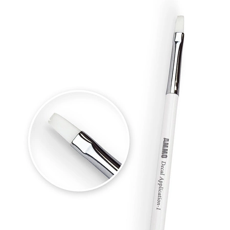 Ammo: Decal Application Brush 1 to wysokiej jakości pędzel modelarski zaprojektowany specjalnie do precyzyjnego nakładania kalkomanii (decalek) na modele plastikowe, żywiczne oraz metalowe. Dzięki odpowiedniemu kształtowi i twardości włosia pozwala na łatwe dopasowanie kalki do powierzchni modelu, niezależnie od jej struktury – także na powierzchniach zakrzywionych i detalicznych.