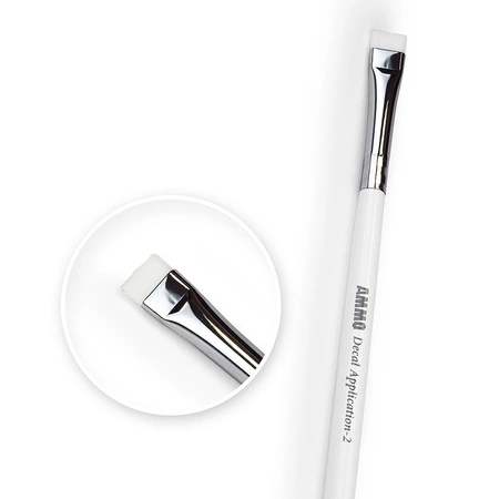 Ammo: Decal Application Brush 2 to profesjonalny pędzel modelarski stworzony z myślą o nakładaniu kalkomanii (decalek) na modele redukcyjne i figurki. Dzięki wyższej numeracji niż w wersji 1, model ten oferuje nieco większe włosie, co pozwala na wygodniejsze operowanie kalkami o większej powierzchni oraz szybsze pokrycie większych elementów modelu.