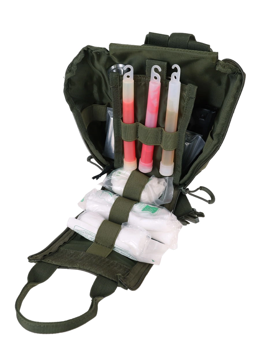 UWAGA! Apteczka nie zawiera wyposażenia. Przedmiotem oferty jest jedynie Apteczka Zrywana Trauma Kit w kolorze WZ.93. Pozostałe elementy służą wizualizacji funkcjonalności.