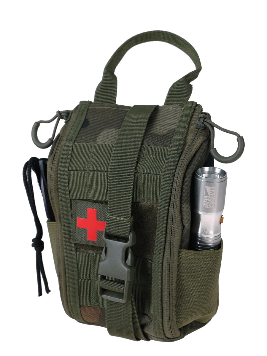 System Rip-Away oraz panel nośny z D-ringami i trokiem z klamrą fastex umożliwiają szybkie i łatwe przymocowanie apteczki do kamizelek taktycznych, plecaków czy pasa. Duży uchwyt do szybkiego otwierania zapewnia jeszcze szybszy dostęp do apteczki w nagłych przypadkach.