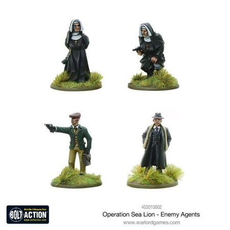 BOLT ACTION Operation Sea Lion – Enemy Agents to wyjątkowy zestaw figurek, które wprowadzają do Twojej rozgrywki elementy tajemniczych agentów w przebraniu. Z pozoru niewinne postacie, jak zakonnice czy miejscowi mieszkańcy, mogą okazać się groźnymi szpiegami lub agentami specjalnymi działającymi na rzecz przeciwnika. Ten unikalny zestaw dodaje scenariuszom Bolt Action warstwę intrygi i zdrady, idealnie pasując do alternatywnej historii inwazji na Wielką Brytanię – Operacji Sea Lion. Każda z figurek ma swoją własną historię, pełną humoru i dramatyzmu.