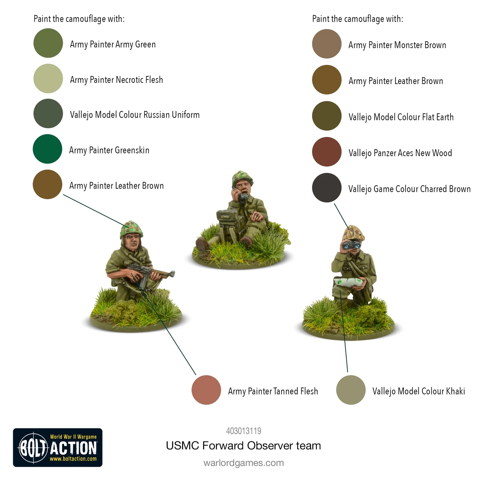 Zestaw USMC Forward Observer Team przedstawia trzy metalowe figurki amerykańskich piechurów morskich (US Marine Corps), idealnych do gier bitewnych takich jak Bolt Action. Forward observers pełnią rolę oficerów łącznikowych, odpowiedzialnych za koordynację ataków lotniczych lub intensywnego ostrzału artyleryjskiego z dalekiego tyłu linii frontu. Często towarzyszy im operator radiowy oraz inne osoby z ich bezpośredniego otoczenia.