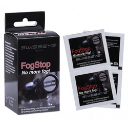 Chusteczki do czyszczenia soczewek od firmy Swiss Eye, nasączone środkiem nanoszącym powłokę Fog Stop, zapobiegającym parowaniu.