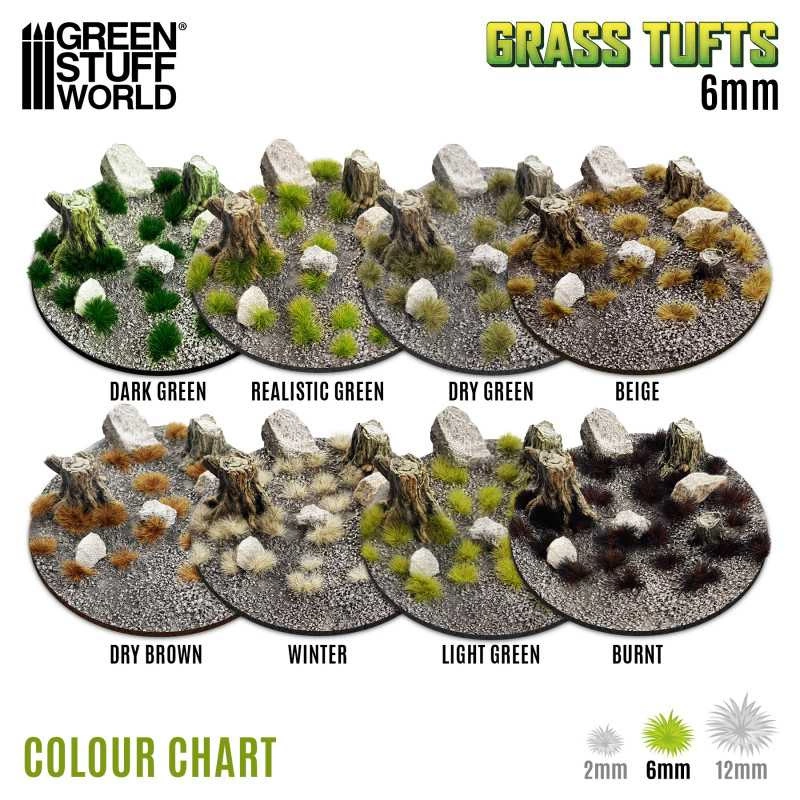 GSW Static Grass Tufts 6mm – Burnt Brown to wysokiej jakości, samoprzylepne kępki trawy modelarskiej w ciemnym, spalonym odcieniu brązu, idealne do odwzorowania spalonych, suchych lub jesiennych krajobrazów. Ich realistyczna barwa i tekstura sprawiają, że doskonale nadają się do tworzenia ponurych, zniszczonych lub opuszczonych terenów, ruin czy pustkowi po bitwach.