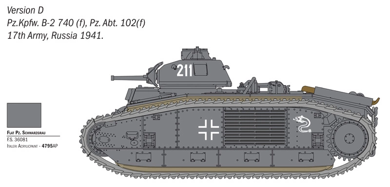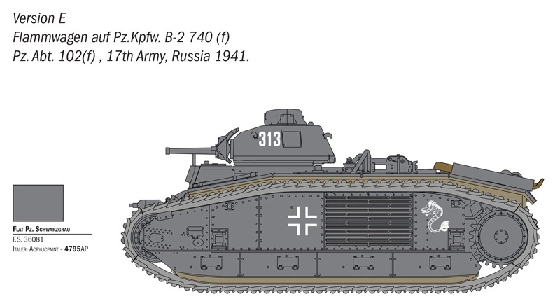 ITALERI Char B1 Bis RI Char B1 Bis to wysokiej jakości model plastikowy w skali, przedstawiający jeden z najbardziej charakterystycznych francuskich czołgów ciężkich z okresu II wojny światowej. Model pozwala zbudować standardową wersję bojową lub wersję miotacza ognia (flamethrower), a bogaty zestaw detali i kalkomanii dla sześciu wariantów historycznych daje szerokie możliwości personalizacji.
