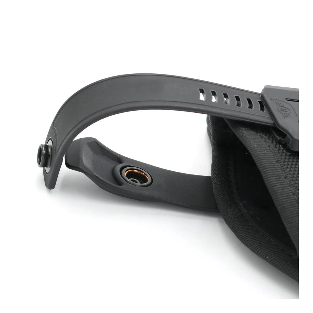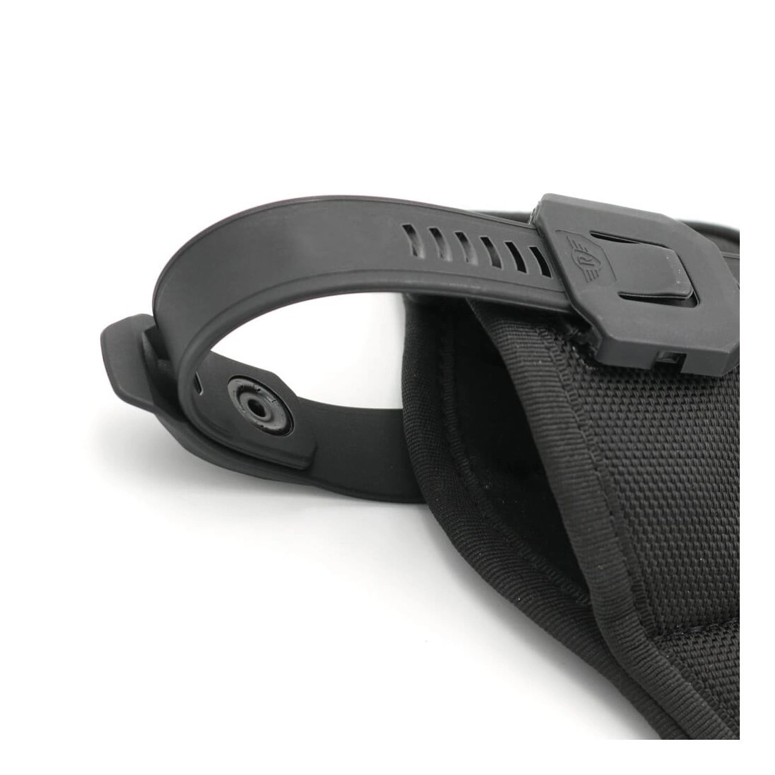 Kabura wyposażona została w regulowane zapięcie zabezpieczające, które zapobiega przypadkowemu wypadnięciu broni. Co ważne – system ten można łatwo dopasować do własnych potrzeb lub całkowicie zdemontować, jeśli preferujesz szybki dostęp do broni.