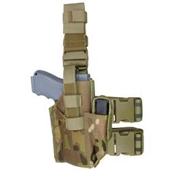 Tactical Leg Holster - kabura udowa wykonana z Cordury 1000D z pełna regulacją przy pomocy taśm Velcro. Na grzbiecie kabury ładownica na jeden magazynek. Kabura pasuje do pistoletów z 4 lub 5 calowym szkieletem - Glock 17, Beretta 92 itp. Kolor MultiCam.