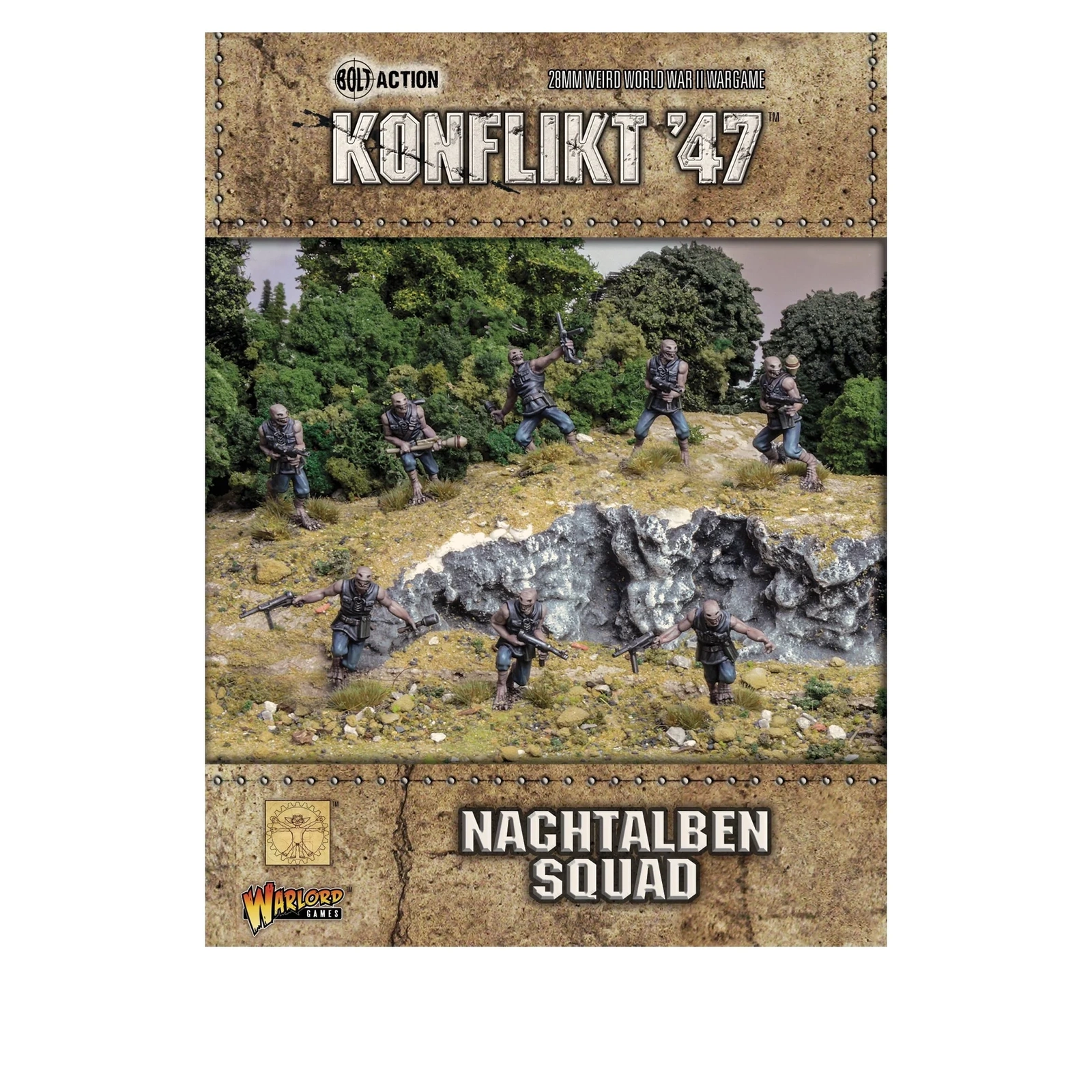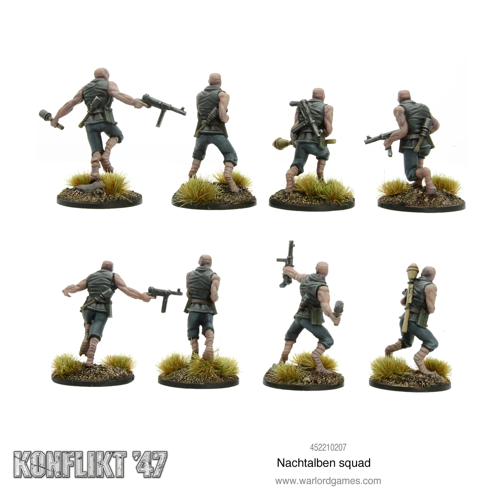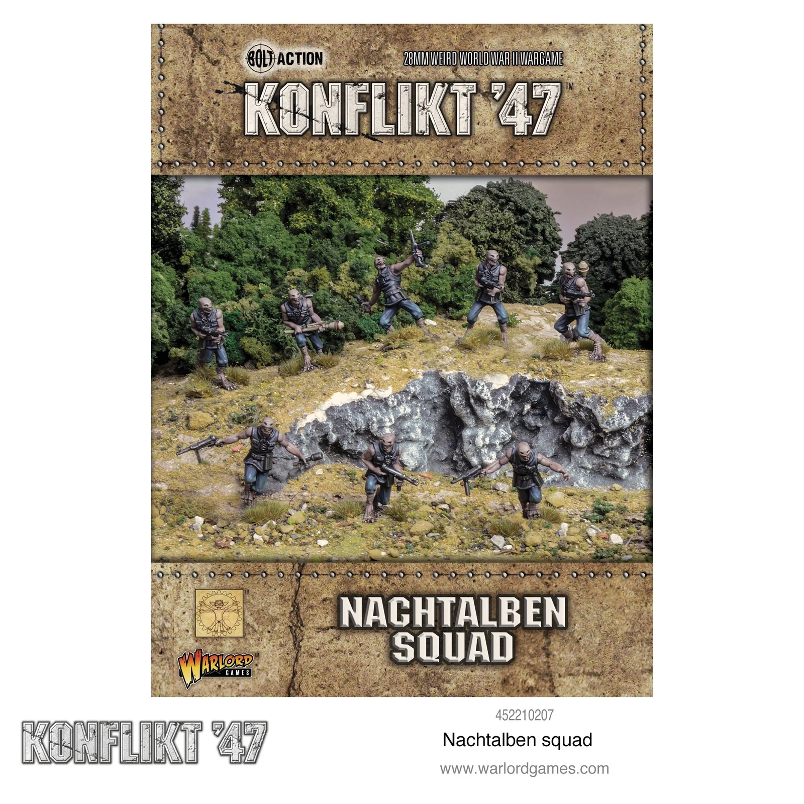 KONFLIKT '47 Nachtalben Squad to elitarna jednostka piechoty, która powstała dzięki stabilizacji technologii pochodzącej z programu Nachtjäger. W laboratoriach Rift-tech w Dreźnie opracowano proces modyfikacji DNA, pozwalający stworzyć żołnierzy wyposażonych w niezwykłe zdolności. Nachtalben, znane również jako "nocne demony", zachowują swoje ludzkie cechy, ale korzystają z wyostrzonych zmysłów i ulepszeń biologicznych, co czyni ich doskonałymi zwiadowcami i jednostkami wsparcia w elitarnych operacjach.