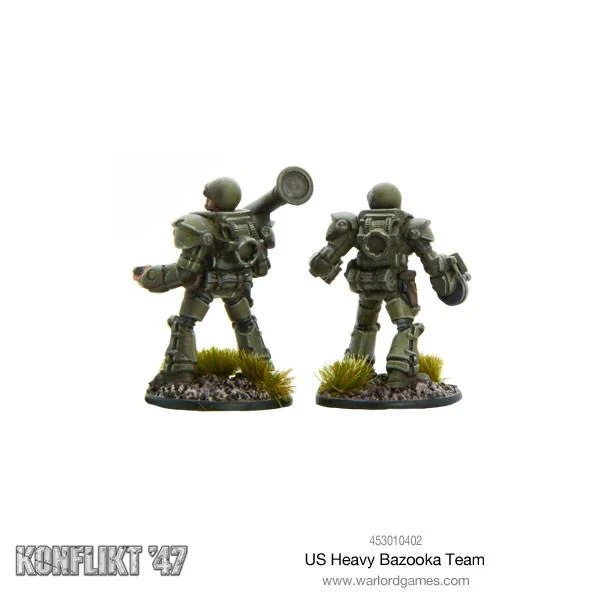 Konflikt '47 US Heavy Infantry Bazooka Team to dwuminiaturowy zestaw amerykańskich żołnierzy wyposażonych w ciężką wersję bazooki, zdolną skutecznie niszczyć nowoczesne niemieckie czołgi. Bazooka ta wykorzystuje ładunek kumulacyjny, podobny do niemieckiego Panzerschreck, co czyni z zespołu niezawodną jednostkę antyczołgową na polu bitwy 1947 roku.