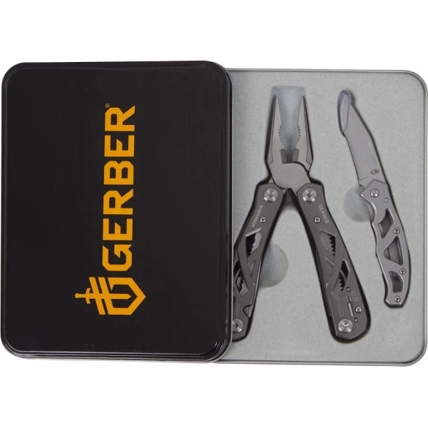 Zestaw prezentowy firmy Gerber składający się z Multitoola NXT, noża składanego Paraframe Mini oraz ładnego firmowego metalowego pudełka.