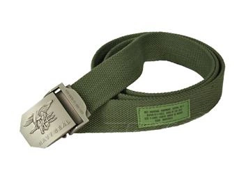 Parciany pas do spodni ze srebrną klamrą z symbolem Fok - komandosów US Navy. Taśma paska jest koloru zielonego i została zakończona metalowym ściskiem zabezpieczającym przed rozwarstwianiem się oraz ułatwiającym przewlekanie przez szlufki.
