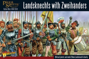 Pike & Shotte Landsknechts with Zweihanders to zestaw figurek stworzony z myślą o graczach, którzy pragną oddać atmosferę nieustannych wojen w Europie pod koniec XV i na początku XVI wieku. W tym czasie pola bitew były zdominowane przez kompanię najemników, a wśród nich szczególnie wyróżniali się barwnie ubrani Landsknechts.