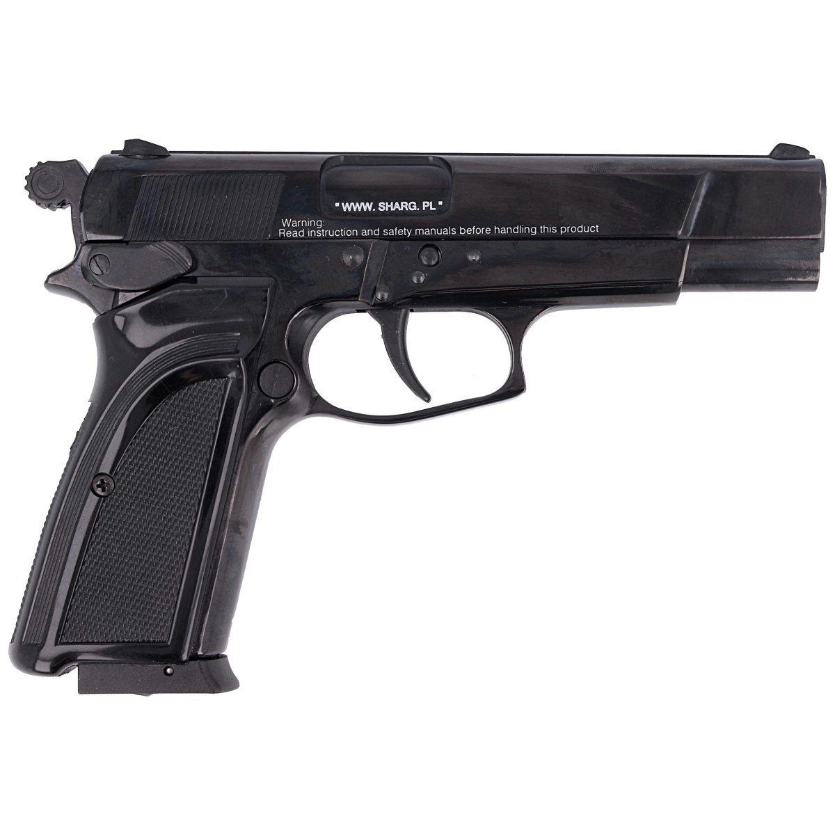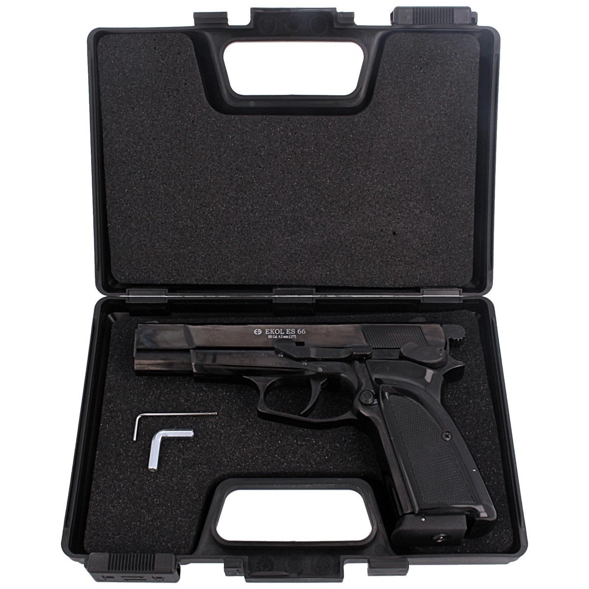 Pistolet EKOL ES 66 został wykonany w całości z metalu, co zapewnia nie tylko autentyczny wygląd, ale także doskonałą trwałość. Rękojeść pokryto ryflowanymi okładzinami z ABS, które gwarantują pewny chwyt podczas użytkowania. Duży, ergonomiczny kabłąk umożliwia komfortowe strzelanie zarówno jedną, jak i obiema rękami.