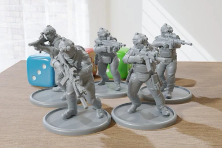 PM - High Risk Operators w skali 28mm to zestaw starannie wykonanych, 3D drukowanych figurek przedstawiających specjalistów do zadań wysokiego ryzyka. Figurki zostały zaprojektowane z myślą o graczach gier bitewnych i RPG osadzonych w realiach współczesnych oraz w klimatach science fiction. Każda figurka wykonana jest z wysokiej jakości żywicy UV, co zapewnia wyraźne detale ekwipunku, uzbrojenia i taktycznych poz.