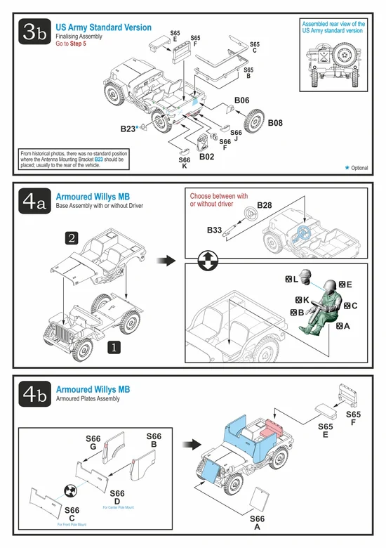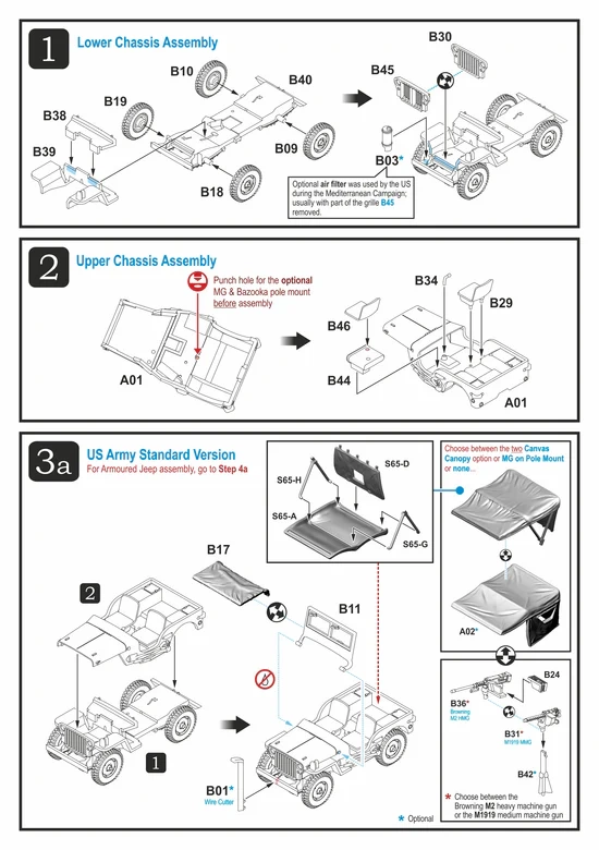 O: Oznacza to, że producent dodał nowe, dodatkowe wypraski z elementami, które oferują więcej opcji konfiguracji i detali dla modelu Willys MB, szczególnie pod kątem wersji US Standard. Należy zapoznać się z obrazkami produktu w celu uzyskania dodatkowych instrukcji dotyczących tych nowych elementów.
