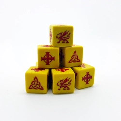 Zestaw kości SAGA Celtic Dice – Welsh przeznaczony jest do użytku wyłącznie z armią Walijczyków w systemie SAGA Age of Vikings. Każda z sześciu ścianek zawiera unikalny symbol, odpowiadający zdolnościom na planszy bitewnej tej frakcji.