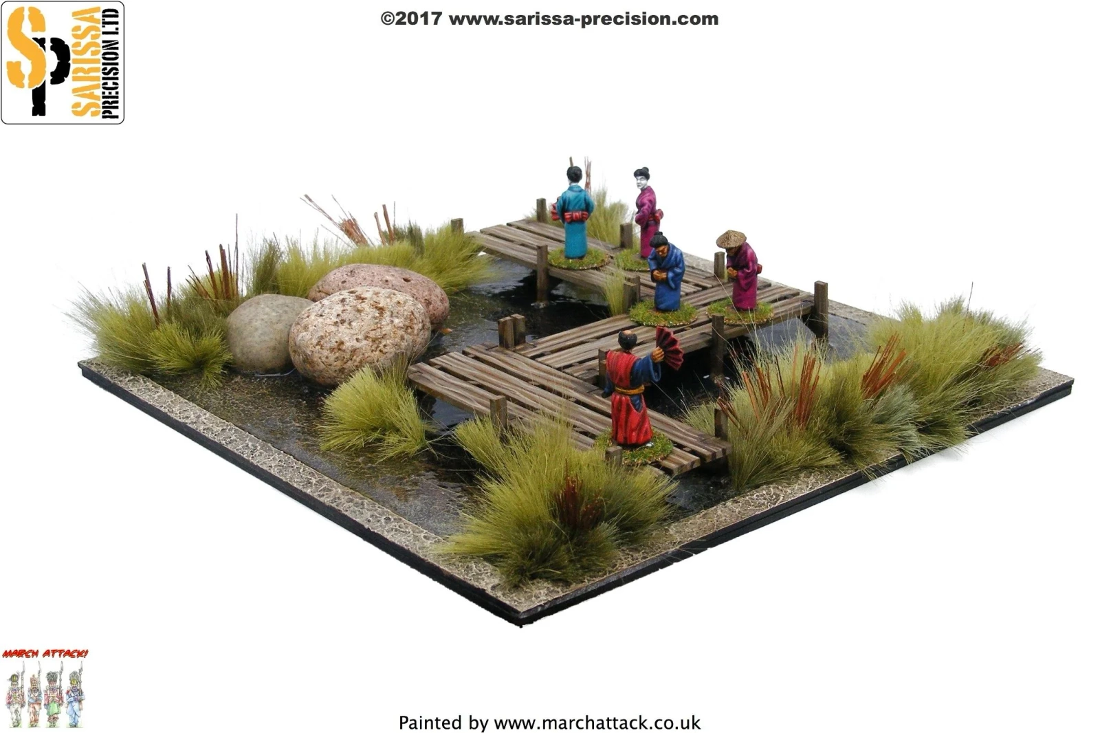 Zestaw Walkway / Bridge Set od Sarissa Precision to uniwersalne drewniane pomosty i mostki, idealne do tworzenia klimatycznych scenerii w grach bitewnych rozgrywanych w rejonach przybrzeżnych, rzecznych lub wiejskich. Doskonale sprawdzą się w dioramach oraz stołach przedstawiających tereny Azji Południowo-Wschodniej, dżungle, pola ryżowe czy obszary nadbrzeżne.