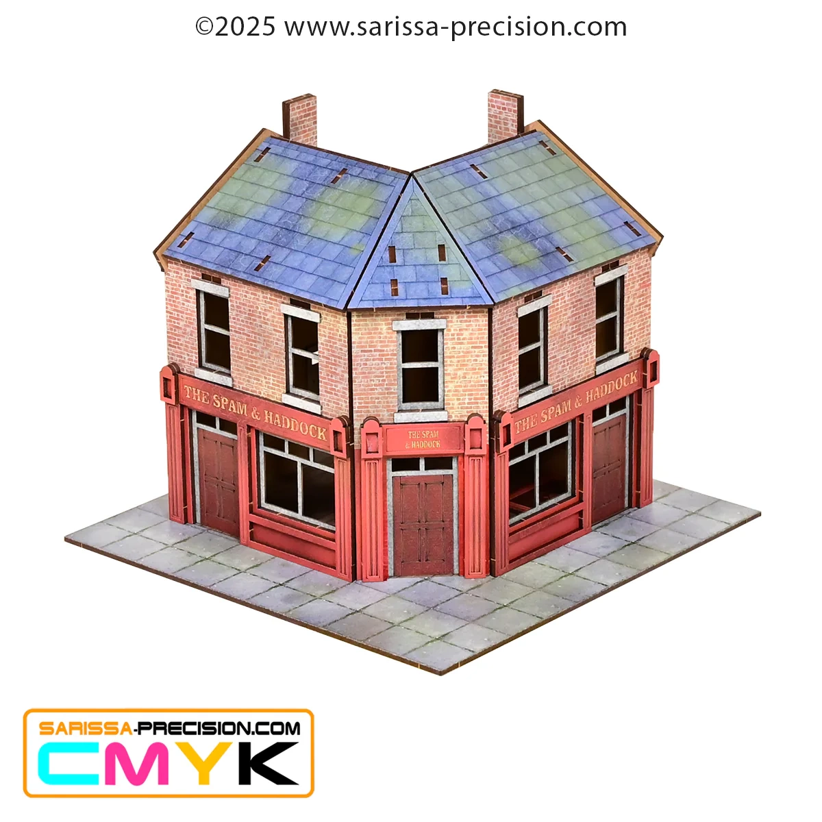 SARISSA – Small Heath Starter Set (CMYK) to kompaktowy zestaw terenowy w skali 28 mm, idealny dla osób rozpoczynających przygodę z makietami miejskimi. Zawiera pięć charakterystycznych budynków – pub, sklep ogólnospożywczy, domy mieszkalne oraz zaułki – które tworzą klimatyczny fragment ulicy, idealny do gier figurkowych i RPG.