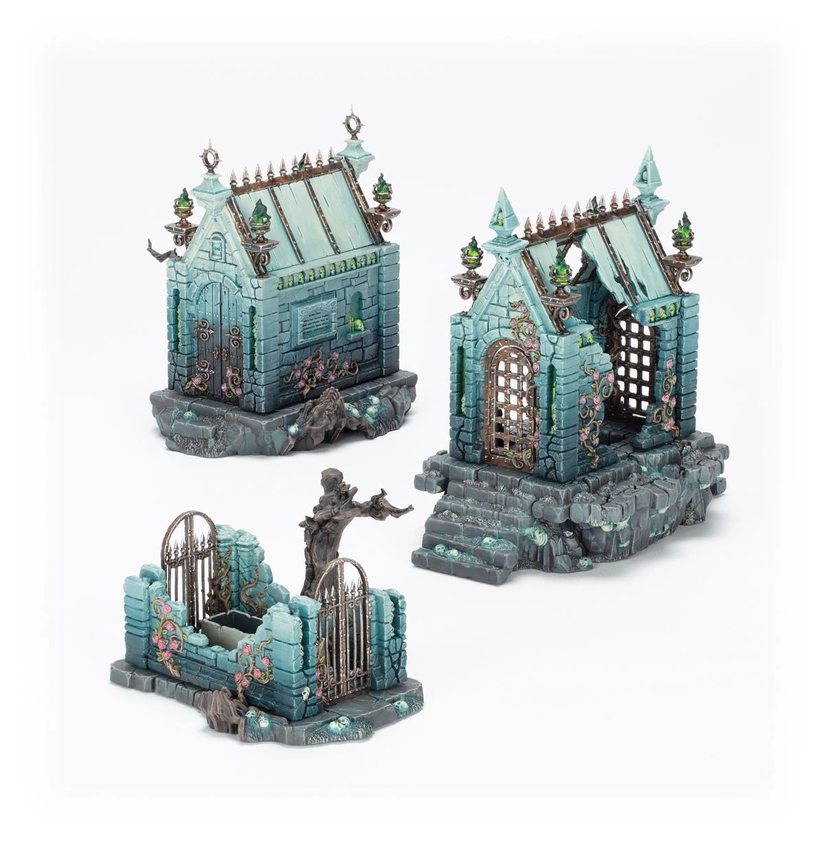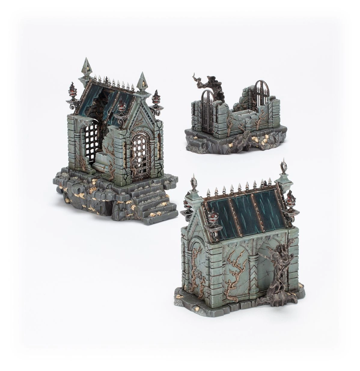 Te trzy makabryczne struktury wzmacniają Twoją armię — wspierają przywoływanie jednostek, regenerują obrażenia i tworzą taktyczne centrum dla Twojej nieumarłej hordy. Alternatywnie zestaw może posłużyć jako Nexus of Grief dla armii Nighthaunt, co czyni go niezwykle wszechstronnym dodatkiem do rozgrywki.