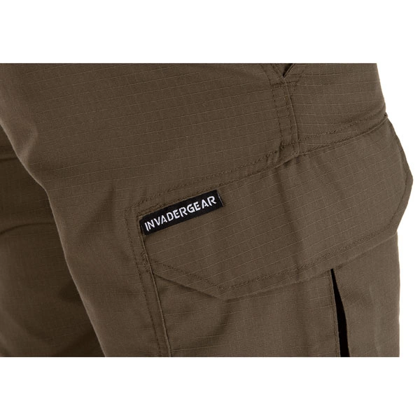 2 duże kieszenie udowe – zapinane na podwójne rzepy, z zaszewką zwiększającą pojemność (na prawej kieszeni znajduje się logo producenta Invader Gear),