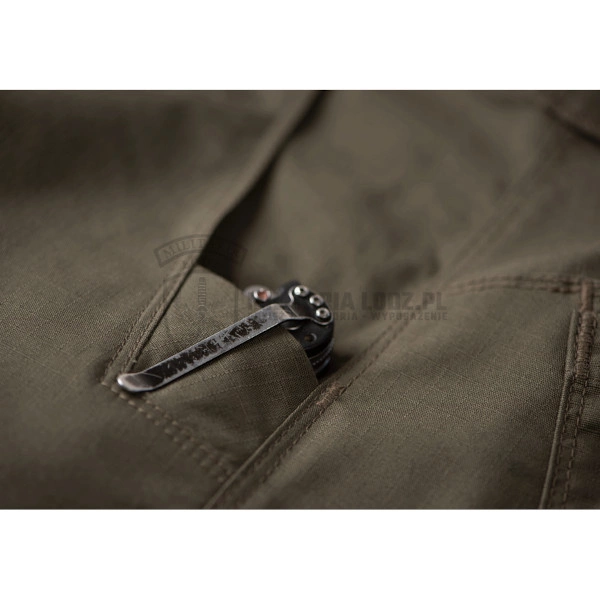 • Elastyczny materiał – Wykonane z mieszanki Policotton RipStop, zapewniającej wytrzymałość oraz swobodę ruchów dzięki dopasowanemu krojowi.