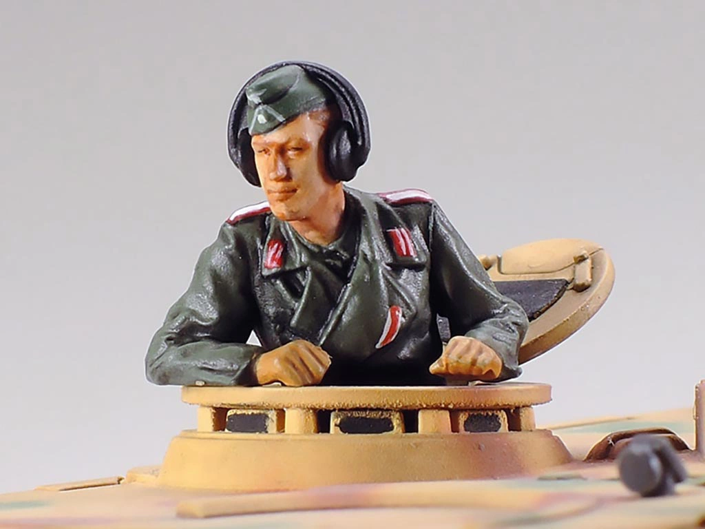 W skali 1/48 Tamiya zazwyczaj stosuje gąsienice segmentowe lub paskowe – szczegóły zależą od konkretnej wersji zestawu.