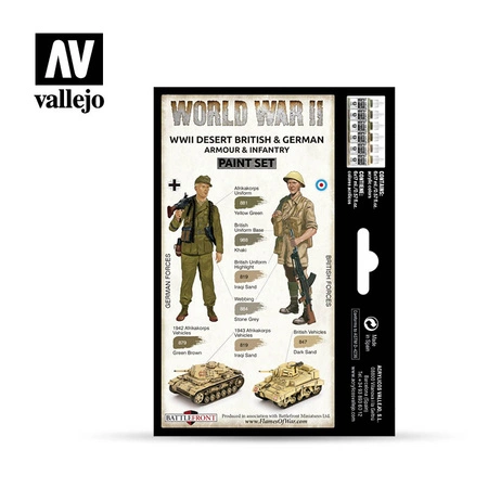 Ten zestaw wraz z zestawem farb podstawowych zawiera wszystkie kolory używane do malowania pojazdów i piechoty brytyjskiej i niemieckiej armii pustynnej.