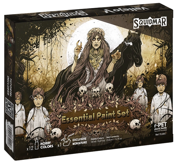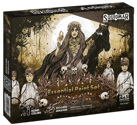 Vallejo: 72.201 - Game Color - Essential Paint Set by Squidmar to starannie skomponowany zestaw farb akrylowych, stworzony we współpracy z uznanym artystą Emilem Nyströmem, znanym jako Squidmar Miniatures. Ten komplet farb został zaprojektowany, aby zapewnić Ci wszystkie podstawowe kolory niezbędne do malowania realistycznych i efektownych figurek. Zestaw obejmuje paletę odcieni skóry, detali skórzanych, tkanin oraz efektów specjalnych, które są niezbędne w codziennej pracy modelarza. Do zestawu dołączona jest ekskluzywna miniaturka oraz kod QR z instruktażowym filmem, który krok po kroku pokazuje techniki malowania.