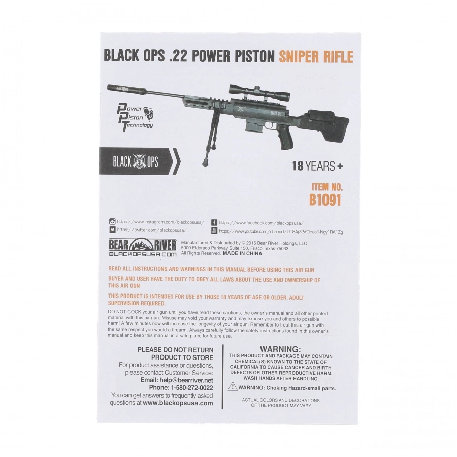 Black Ops Sniper 5,5 mm osiąga prędkość początkową 180 m/s (~16 J), co pozwala na celne strzelanie rekreacyjne nawet na dystansie 50 metrów. Regulowana baka policzkowa i możliwość dopasowania długości kolby sprawiają, że karabinek idealnie dopasowuje się do budowy strzelca i wybranej optyki.