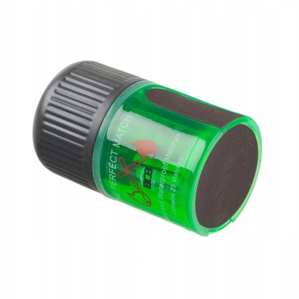 Zapałki umieszczono w wodoszczelnym pojemniku z zakrętką, który chroni je przed wilgocią i uszkodzeniami mechanicznymi. W zestawie znajdują się 25 sztuk zapałek oraz trzy powierzchnie zapalne (strikery), w tym jedna chroniona przed wilgocią.