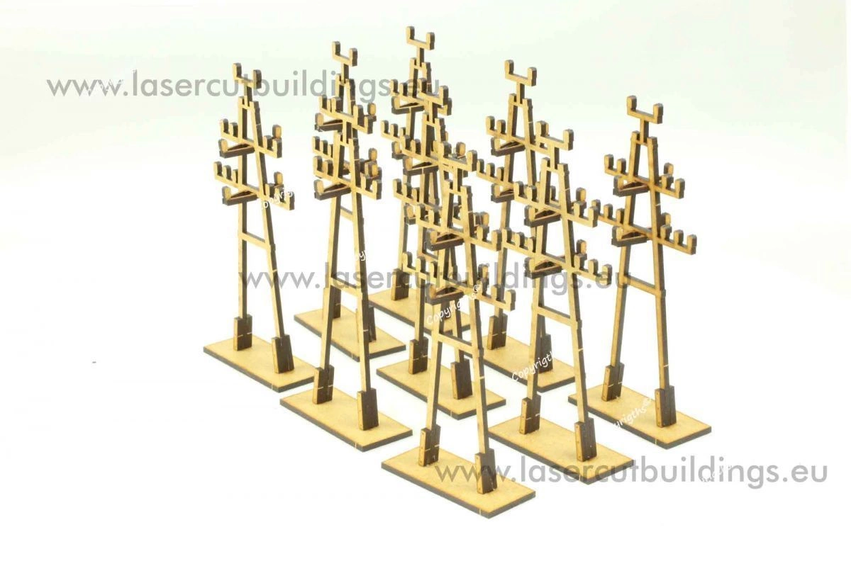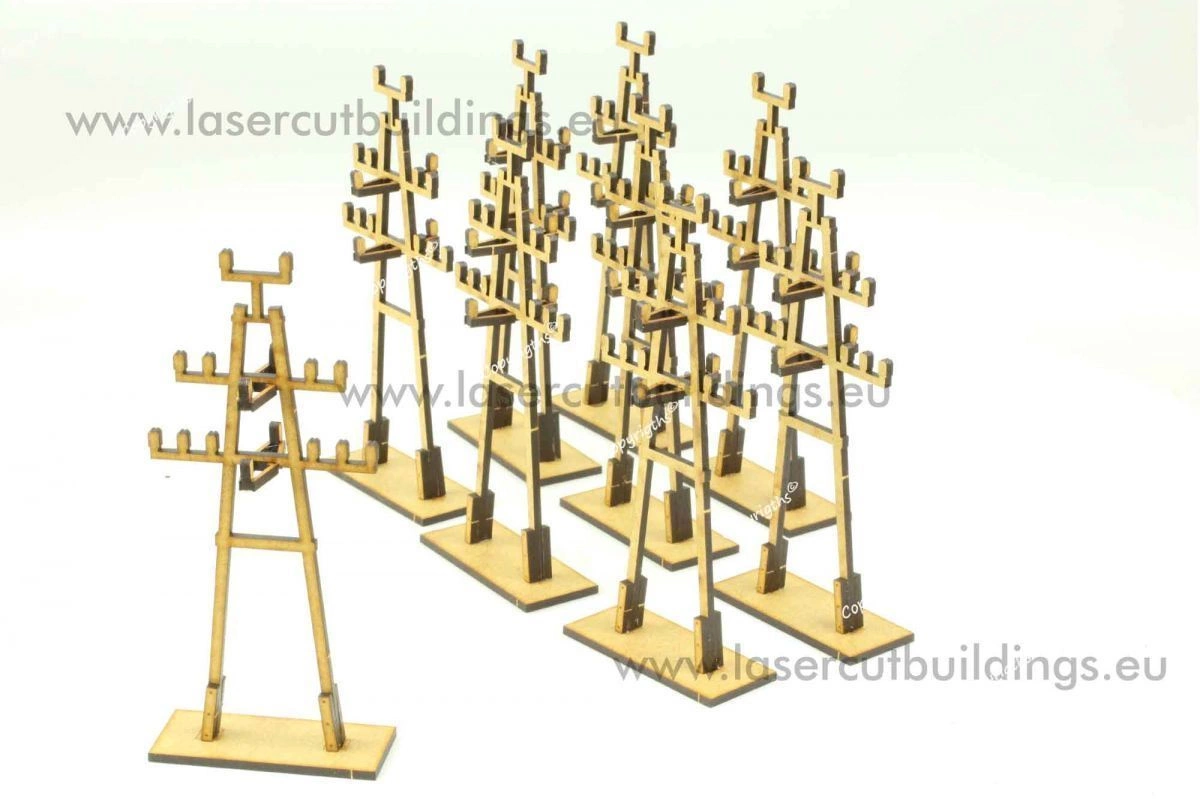Zestaw słupów I LBH0973 – 1:56 / 28mm to realistyczny model konstrukcji przemysłowej, idealny do makiet, dioram i terenów do gier bitewnych. Wykonany z wysokiej jakości płyty HDF o grubości 3 mm, łączy w sobie trwałość, precyzję wykonania i łatwość montażu.